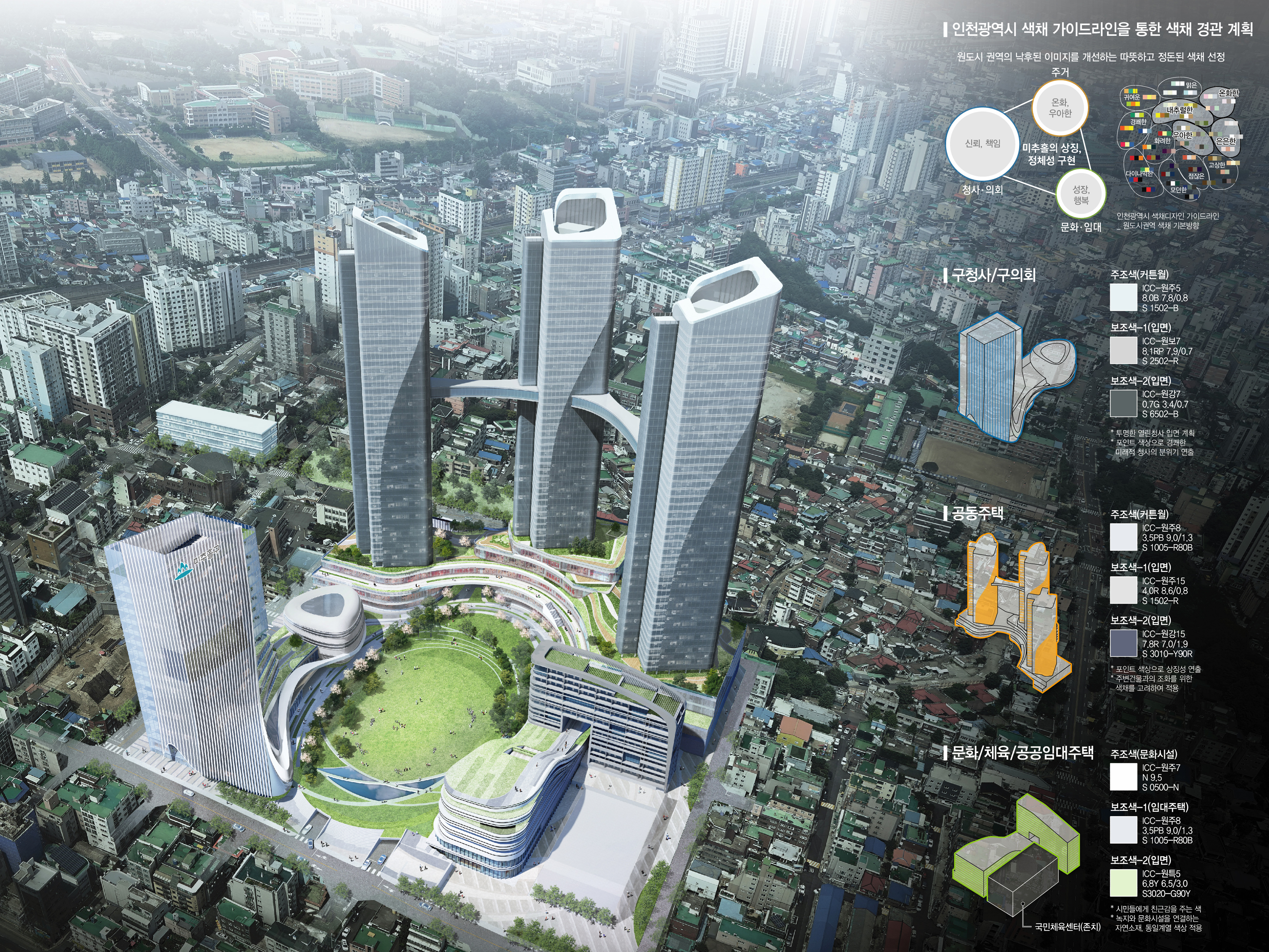 미추홀구를 어우르는 형태 계획으로 양질의 행정서비스 제공과 주민과의 다양한 소통과 공유공간으로 열린 청사 계획